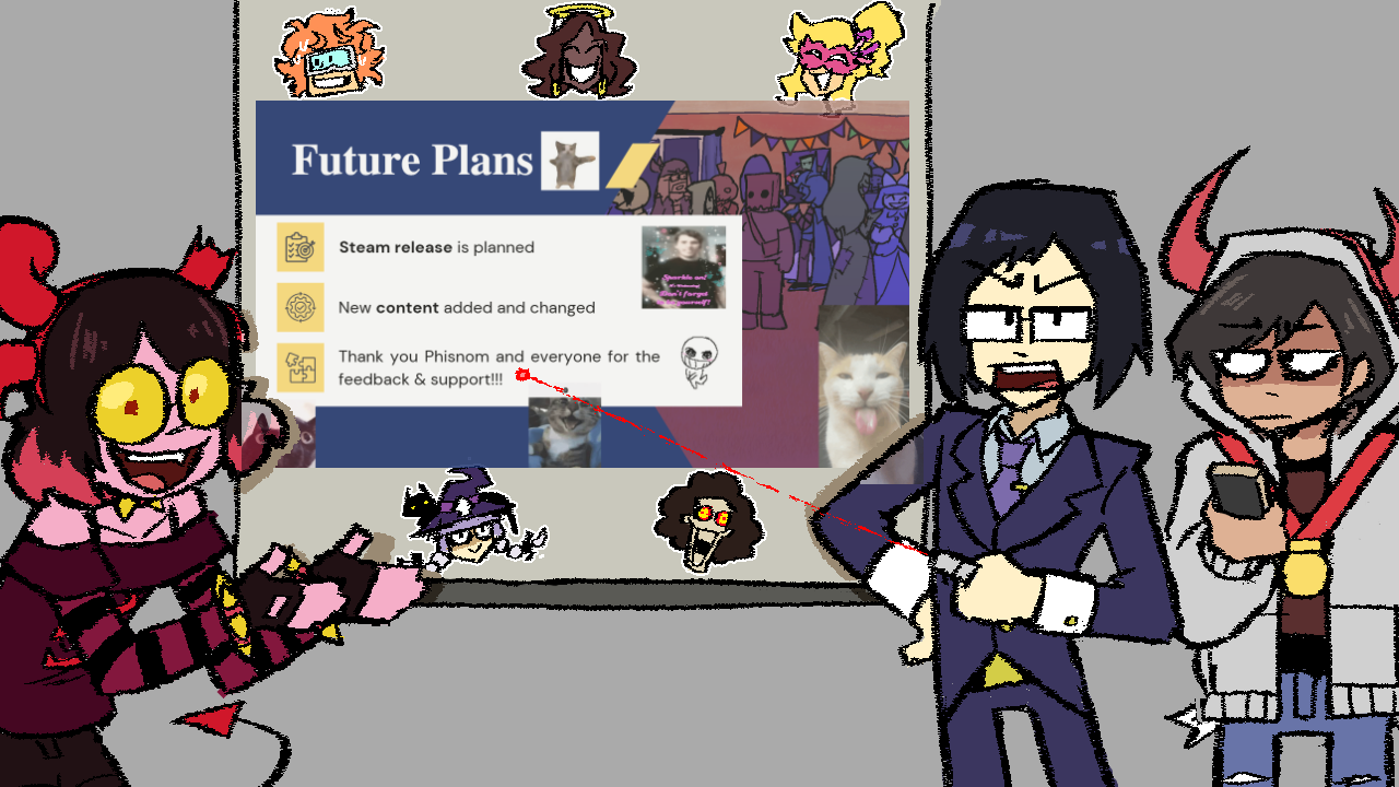 Righto!! If you want to stay updated, follow SolidTheCat and Lad on their socials as well as this Itch page!! There’s so so so much exciting stuff planned, such as… gasp… new people to meet?